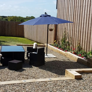 French doors open to the rear garden which is enclosed by traditional Pembrokeshire hedge walls. Opposite this, a couple of steps down lead down to the full-kitted kitchen/diner seating up to 16 people. A second set of French doors lead out to the front of the property, from where you can access our fields.